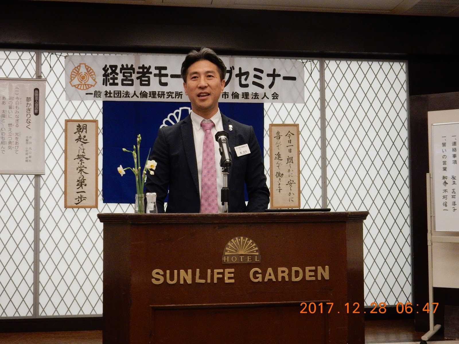 常に自分への倫理を問い、厳しく倫理を学ぼうとする姿勢に対し尊敬してやまない、星武司会長の今年最後のモーニングセミナーの講話であり、会員一同がとても楽しみにお迎えしました。一日のほとんどが倫理法人会活動にあてられている県会長の現状を、将来への自分の投資であるとにこやかに話される姿勢に、心から敬意を感じました。